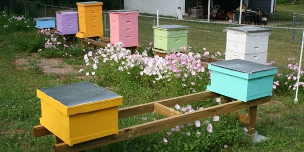 Upon graduation I set up my first hive, in April of 2008. Today I have twenty+ hives. The hives I set up are in a multitude of colors: pink, green, yellow, aqua, lavender, blue, pumpkin and peach. Sometime the "girls" think they are in Charleston on Rainbow Row.